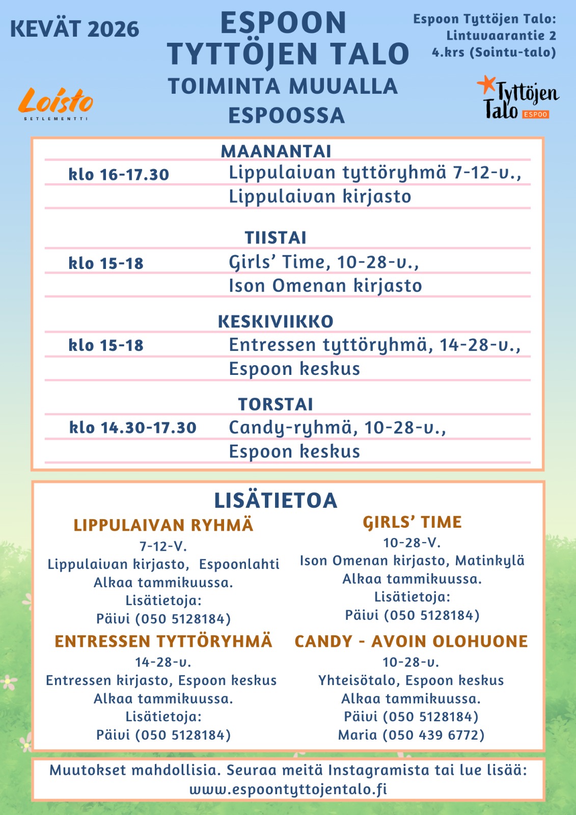 Onko Leppävaaraan liian pitkä matka, mutta haluaisit viettää aikaa tyttöporukalla turvallisesti? Voit tulla paikalle yksin tai kaverin kanssa. Ohjaajat ovat paikalla sinua varten.