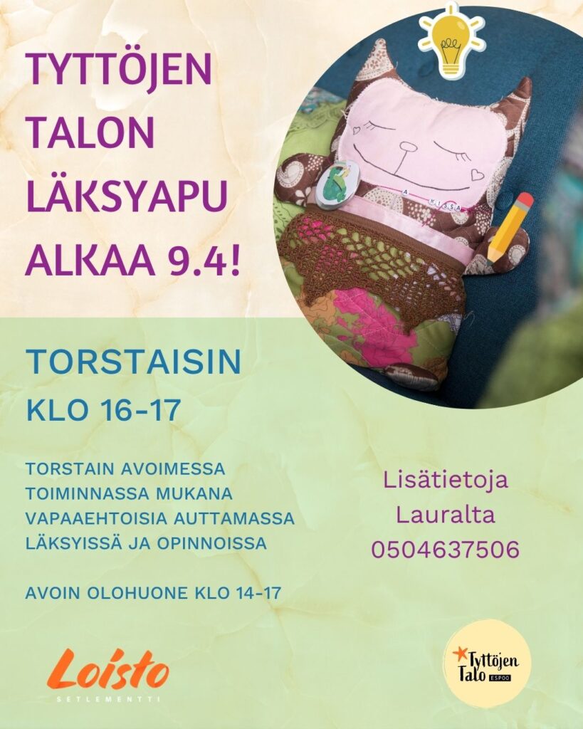 Huhtikuussa alkaa avoin LÄKSYAPU torstain olohuoneen yhteydessä. Maanantaisin alkaa MAKUJA MAAILMALTA – yhteinen ruoanlaittoryhmä. Jokaiselle kerralle tulee ilmoittautua erikseen ja mukaan mahtuu 8 kerrallaan. Keskiviikkona jatkuu ”VOI HYVIN KEHOSSA” -teemainen matalan kynnyksen avoin liikuntaryhmä – yhdessä kävelyä tai rauhallista liikkumista Tyttöjen Talon salissa. Katso lisää linkeistä!
